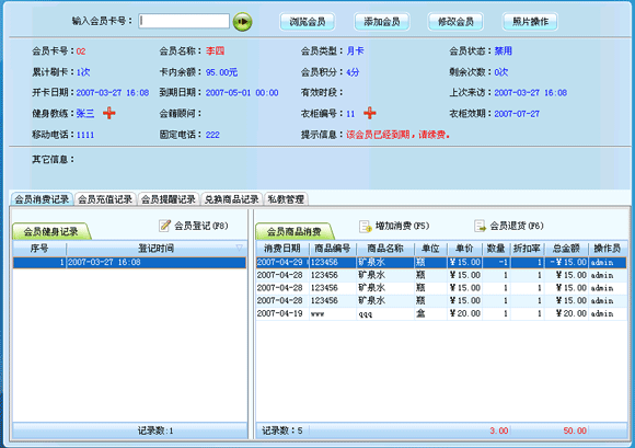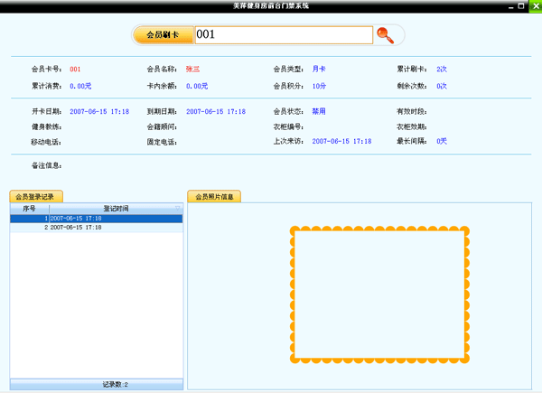 會員刷過卡后會顯示出該會員的基本信息,如果該會員卡到期或該會員請假等特殊情況,系統會有提示。界面左下角顯示的是該會員登記的記錄,右下解顯示的是該會員的照片。