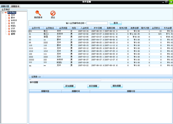 會員管理主要包括會員基本信息、會員充值統計、事件提醒、會員請假管理、私教管理。