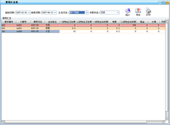 ·用來統計每戶各種應交物業費的收款情況,可分別查詢每戶已收物業費和未收物業費的匯總統計,此報表可一目了然的了解到每戶所有物業費的收取情況,為催繳物業費提供了直觀的參考信息。